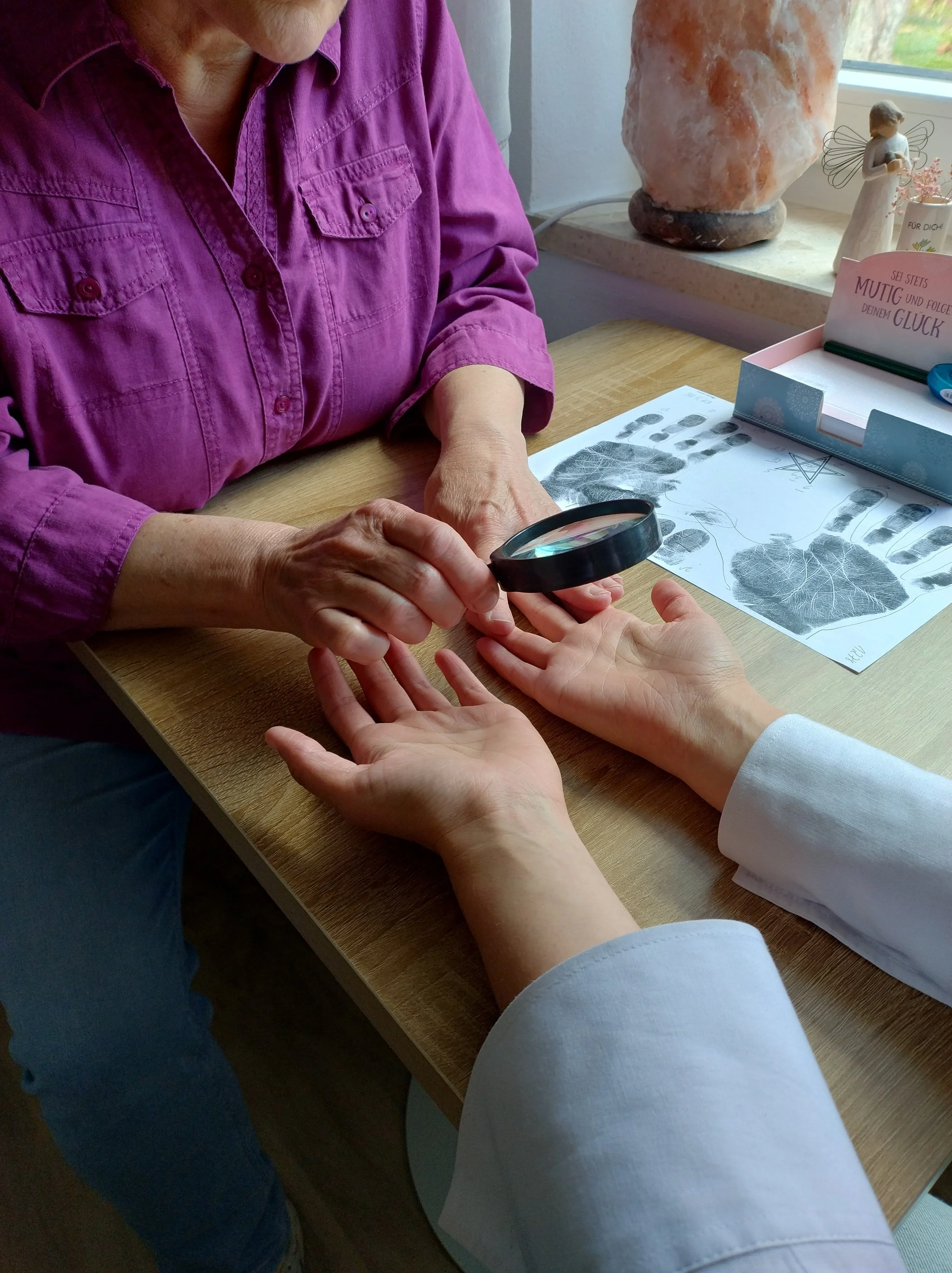 Die Hände, insbesondere die verschiedenen Linien in der Handfläche, spiegeln Ihr Leben und Ihren Charakter. Bei der Handanalyse geht es mir darum Ihre Persönlichkeit zu erkennen und Potenziale aufzuzeigen. Solche, die Ihnen bekannt sind, und auch die, die noch in Ihnen schlummern.